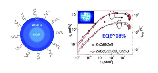 Two types of QDs of ZnCdS/ZnS and ZnCdS/CdxZn1−xS/ZnS were incorporated into the solution-processed hybrid QD-based light-emitting devices structure as emissive layer. We find that the presence of CdxZn1−xS shell makes a profound impact on device performances such as external quantum efficiency and current efficiency. The corresponding light-emitting diodes exhibited a high EQE exceeding 18%, a peak current efficiency of 3.4 cd A-1and low efficiency roll-off.Such excellent results of ZnCdS/CdxZn1−xS/ZnS based QLED are likely attributable to the QD‘s high PL QY and very thin ZnS outermost shell which did notsacrifice charge injection efficiency in QLED.