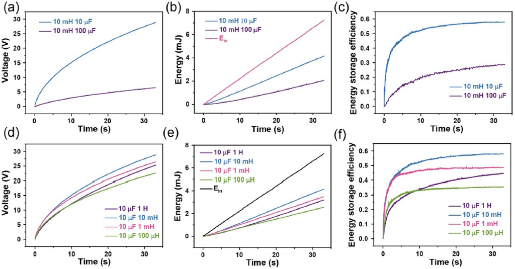 Fig. 3. Actual test results of the voltage of C2, the stored energy, and the energy storage efficiency of the passive power management circuit. Dependence of (a) the voltage of C2, (b) the total stored energy, and (c) the energy storage efficiency of the passive power management circuit under different capacitors on time. Dependence of (d) the voltage of C2, (e) the total stored energy, and (f) the energy storage efficiency of the passive power management circuit under different inductors on time.