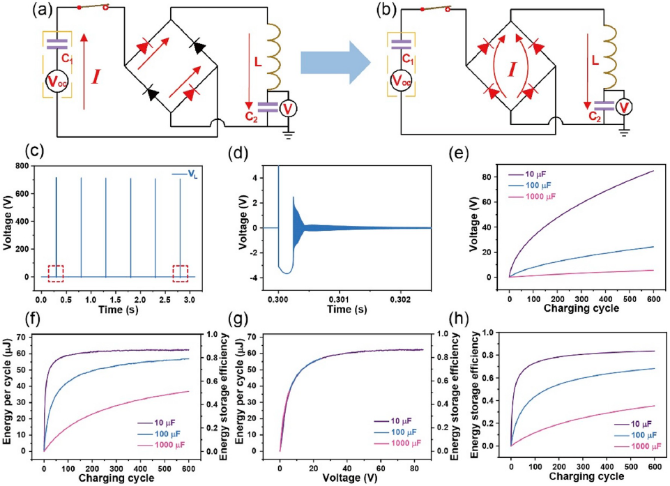 Fig. 2. The energy transfer process of the passive power management circuit. Schematic diagram of the passive power management circuit in (a) first energy transfer stage and (b) second stage. The simulated (c) voltage of the inductor in the passive power management circuit and its magnification in (d) first charging cycles. Dependence of (e) the voltage of C2 and (f) the stored energy and energy storage efficiency per charging cycle on charging cycles. (g) Dependence of the energy and energy storage efficiency per charging cycle on the voltage of C2. (h) Dependence of the total energy storage efficiency on charging cycles.