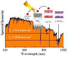 Cu2ZnSnS4 (CZTS) is an excellent direct band gap semiconductor material, but its application as sensitizer in quantum dot solar cells has rarely been reported. In 2015 and 2016, it is reported by Prof. Wu Sixin’s group that CZTS QD and its core-shell structured QDs were prepared by ligand hydrolysis and cation exchange surface functionalization method, respectively. However, limited by the narrow light response range of quantum dots and harmful defects inside the material, the efficiency obtained is inferior to other high-efficiency sensitizers. Therefore, how to broaden the absorption range of CZTS material while reduce the electronic recombination is the key to realize its application in QDSC.