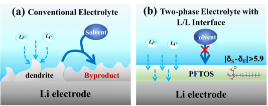 Figure (a): Corrosion and dendrite growth of lithium electrode in traditional electrolyte system; (b) Two phase electrolyte system at liquid/liquid interface inhibits corrosion and dendrite growth of lithium electrode and enhances stability of lithium electrode.