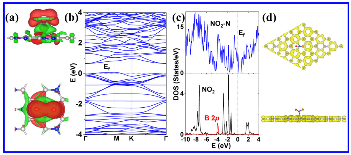 Figure: Theoretical characterization of the electronic structure of NO2 adsorbed B-doped C3N surface.
