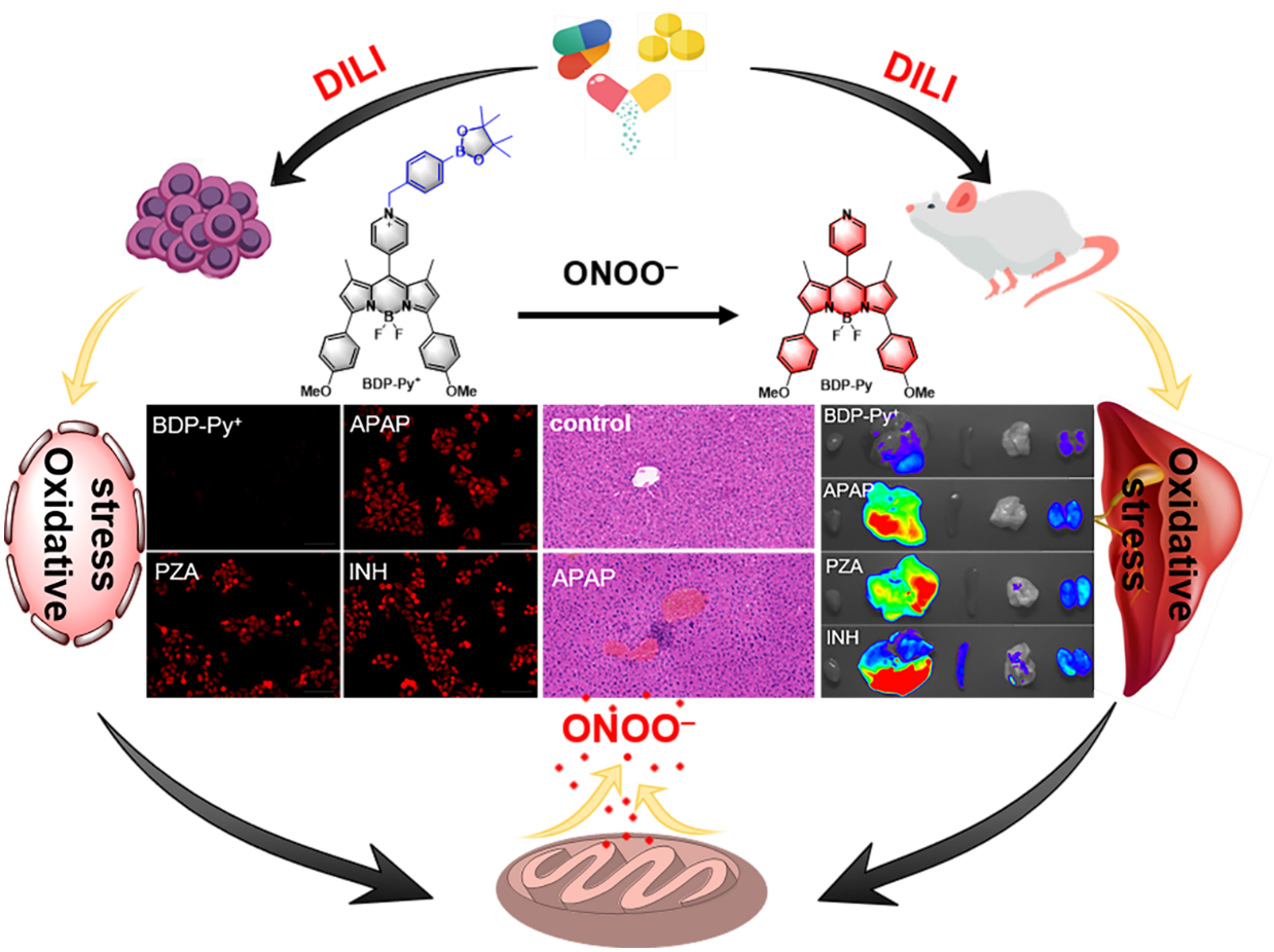 Pyrazinamide (PZA), isoniazid (INH) and rifampicin (RFP) are all commonly used anti-tuberculosis drugs in clinical practice, and long-term medication may cause severe liver damage and toxicity. The level of peroxynitrite (ONOO) generated in liver has long been regarded as a biomarker for the prediction and measurement of drug-induced liver injury (DILI). In this article, we constructed a BODIPY-based fluorescent probe (BDP-Py+) that enabled quickly and sensitively detect and image ONOO in vivo. Utilizing this probe, we demonstrated the change of ONOO content in cells and mice model of DILI induced by acetaminophen (APAP), and for the first time revealed the mechanism of liver injury induced by antituberculosis drug PZA. Comparing with the existing serum enzymes detection and H&E staining, the probe could achieve early diagnosis of DILI before solid lesions in liver via monitoring the up-regulation of ONOO levels. Collectively, this work will promote the understanding of the pathogenesis of anti-tuberculosis drug induced liver injury (ATB-DILI), and provide a powerful tool for the early diagnosis and treatment of DILI.
