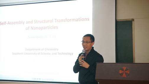 权泽卫教授作了题为“Self-Assembly and Structural Transformations of Nanoparticles”的学术报告。权教授的报告从讲解美丽的南方科技大学校园开始,然后从纳米组装的概念、原理入手阐述了基于纳米材料表面的有机配体的弱相互作用力,建立和发展纳米材料自组装中的新方法和新结构,创造新型的功能自组装体系,实现单个纳米材料在多个尺度范围内(包括纳米尺度、介观尺度、宏观尺度)精确控制的组装。接着采用高压的手段有效地缩短原子之间的距离,进而改变物质的晶体结构、电子状态等本征属性,调节甚至控制材料的性质变化,捕获了许多常压下难以探知到的新奇现象。权老师课题组将高压手段用于研究纳米材料结构与性质的内在联系,进而深入认识纳米材料的物理本质,为材料、能源、生命和信息领域提供创新的物质基础,在拓展新材料方面具有非常重要的科学意义。