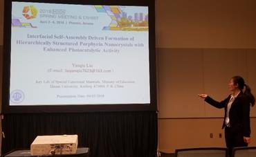 在读研究生参加国际大型会议获奖的一次突破。田淑芳同学的墙报“Morphology Controlled Self-Assembly and Synthesis of Porphyrin Nanocrystals with Enhanced Photocatalytic Performance”获得了NM03:“Rational Designed Hierarchical Nanostructures for Photocatalytic Systems”分会的最佳Poster奖。同时刘艳秋同学做了“Interfacial self-assembly driven formation of hierarchically structured porphyrin nanocrystals with enhenced photocatalytic activity”口头报告,田淑芳同学做了“Whenporphyrin meet graphite carbon nitride as efficient visible-light photo-catalyst”口头报告。