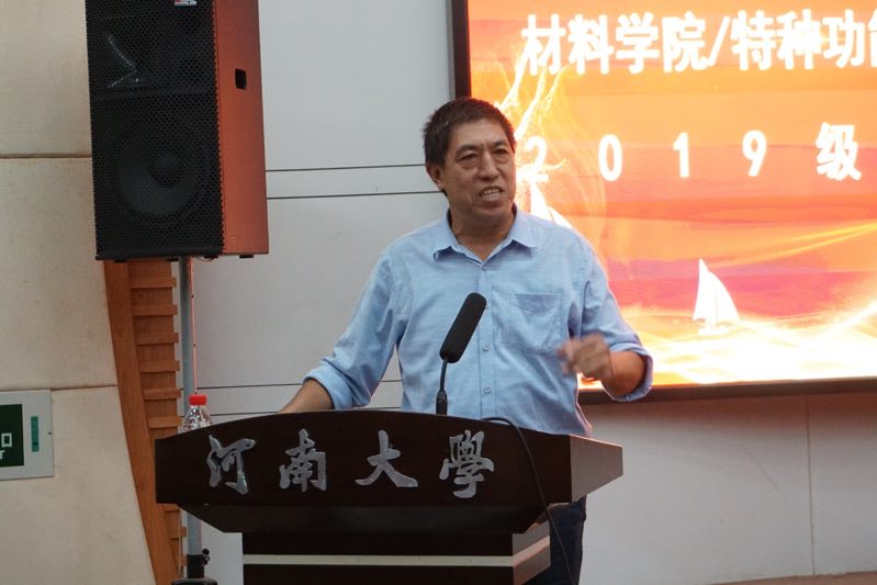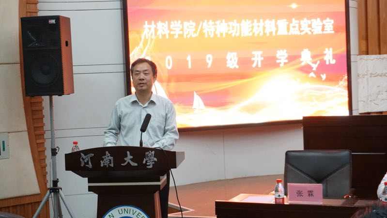 材料学院院长、特种功能材料重点实验室主任杜祖亮发表讲话。他首先对2019年新入学的105名本科生、硕士研究生、博士研究生表示热烈的欢迎;对大家在学院/实验室发展的关键时期,选择学院/实验室、为单位的发展注入新生力量表示衷心感谢!他从学院的功能定位、发展理念、师资力量等方面详细介绍了学院在人才培养模式、理念、资源上的优势和创新。他说,从此我们都有了一个共同的名字“特功人”!这个新型学院特殊的地方在于一是特聘教师等高层次人才密集,师资队伍强大,二是有王中林院士(实验室学术委会主任)、江雷院士(名誉院长)等一大批国际大师指导;三是真正的研究型学院,研究生比本科生多一倍、师生比是2:1,这种“小而精”的模式是保证高端精品人才培养的基础。这个独一无二的学院,将成就独一无二的你们!