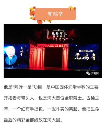 组委会给党院士的颁奖词是:他是“两弹一星”功臣,是中国固体润滑学科的主要开拓者和带头人,也是河大首位全职院士。古稀之年,一个红布手提包,一张朴实的笑脸,他把生命最后的精彩全部绽放在河大园。