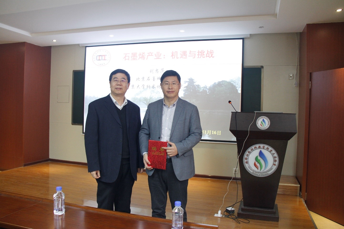 杜祖亮回顾了实验室与刘忠范院士之间学术交流的渊源,欢迎刘忠范院士时隔八年再次来到实验室讲学。刘忠范院士作了题为《石墨烯产业:机遇与挑战》的报告。刘忠范院士从“制备决定未来”、“从万金油到杀手锏级的应用”和“石墨烯究竟能走多远”等方面讲述石墨烯领域发展的机遇和挑战。刘忠范院士详细介绍了其领导的团队在标号石墨烯薄膜、超级石墨烯玻璃、超级石墨烯光纤和三维石墨烯粉体等方面取得的最新研究进展,重点阐述了石墨烯薄膜作为理想外延生长缓冲层在第三代半导体照明器件中的应用,并提出了石墨烯在智能新能源汽车、核反应堆、强激光装置等领域应用的新概念、新策略。此外,刘忠范院士解读了北京市加快推动石墨烯科技创新发展的相关政策,介绍了由其领衔的北京石墨烯研究院的基本情况和重点研发方向,阐明了研究院的定位和核心发展理念,展望了石墨烯产业非常广阔的发展前景,以及对国家科技发展难以估量的推动作用。同时,刘忠范院士也指出,我国是石墨烯基础研究大国,在全球石墨烯科技发展和产业竞争中扮演着重要的角色,但是目前石墨烯市场化发展仍存在产业布局零散,群众运动式的盲目跟风以及企业核心竞争力不强等问题。