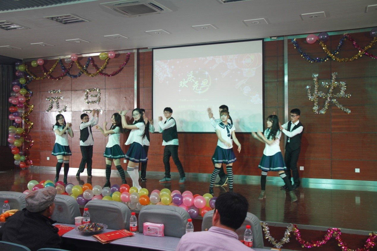 一串串气球高悬,一条条彩带飞舞,在欢快的音乐声中,特功研究生精心准备的开场舞拉开了元旦联欢会的序幕。