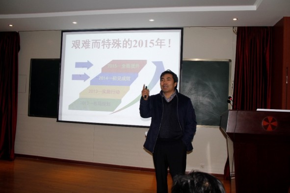 闭幕式上,实验室常务副主任杜祖亮教授对这次会议进行了全面总结。他首先对国家自然科学基金申报讲解汇报做了总结,同时全方位的介绍了基金申报经验,重点围绕基金撰写要突出强调“为什么你要做”和“为什么要你做”,激励青年教师加大基金创新力度,获得更好的成绩;其次,在对实验室做成果总结时,他说,2015年是实验室艰难而又特殊的一年,但是实验室全体人员紧密团结、共同努力,按照既定方案实现了预期目标。在平台建设上,完成了量子点发光二极管(QLED),光伏和纳米器件三个基础平台的搭建工作,为三个方向的快速发展奠定了坚实基础。其中,2015年实验室获批了省发改委的“高效照明与显示技术河南省工程实验室”。在方向凝练上,实验室科研方向进一步集中,目前已经完成了从“打哪指哪”到“指哪打哪”的转变,三个平台方向科研进展快速推进;在人才培养方面,A计划实施成果显著,程纲教授获批2015年国家自然科学基金优秀青年基金项目,成为继去年白锋教授之后我校第二位国家优青。2015年,实验室在A计划基础上,启动实施了“a人才培养计划”,强力助推八零后青年学者的快速成长,遴选了申怀彬、王永强、周文辉三位八零后博士为首批“a计划”人选。此外,从日本东京大学留学归来的赵勇博士签约实验室,成为我校“攀登计划”教授,人才队伍得到进一步加强。但是他强调我们仍需清醒的认识到,在各项重要指标上对比上,实验室与其他国家重点实验室的差距依然遥远,压力依然重大,虽然目前实验室在人才方面实现了零的突破,但是清零行动仍需继续。此外,他还特别强调,集中力量,强力执行是实现实验室目标的根本保证,新的一年A、B、C计划将深入贯彻执行,全面提升实验室整体科研实力。最后他希望实验室全体人员努力拼搏、不断进取,在新的一年里,每一个人都取得更大的成绩,齐心协力为实验室发展开创新的局面。