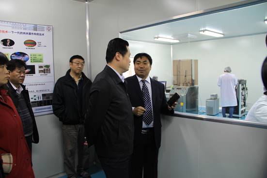 随后,贾厅长一行实地考察了一楼的QLED新型发光显示技术的实验场所和部分仪器设备。在透射电镜室、扫描电镜室,贾厅长详细询问了设备的功能、型号、价值,以及设备的使用情况。在纳米压印室,杜祖亮详细介绍了实验室最近几年组建起来的纳米压印技术、原子层技术和喷墨打印技术。他说,该实验系统居于国际先进水平,可以大面积、低成本的制备纳米精度的图案,是发展纳米器件的关键技术。实验室利用这些技术平台着重开展两个方面的工作,一是新型薄膜太阳能电池方面的研究,主要目标是发展后硅时代的光伏技术;二是量子点发光二极管(QLED)的研究,研发下一代照明和显示技术。贾厅长仔细询问了纳米压印、喷墨打印技术的原理、主要功能和性能指标,杜祖亮教授对厅领导关心的问题一一进行回答。