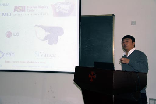11月26日下午,应特种功能材料重点实验室邀请,美国nanophotonica公司副总裁,苏州瑞晟太阳能科技有限公司副总经理,钱磊研究员在实验室二楼报告厅做了一场题为:“无机纳米材料在有机光电器件中的应用”的学术报告。报告会由王华教授主持,特种功能材料重点实验室以及化学化工学院、物理学院等相关专业的师生聆听了报告。