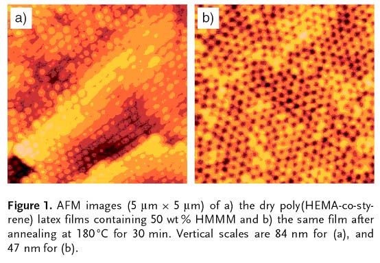为此,实验室提出了制备聚合物孔材料的新方法—自组装法。该方法首先利用无皂乳液聚合法合成具有核壳结构的聚合物乳胶球,该结构具有疏水的核层和亲水的壳层;然后直接掺杂一定量的密胺(HMMM,一种亲水的交联剂),室温下干燥成膜,由于密胺具有亲水基,故而集中分布在壳层,在高温下使其和聚合物微球交联,交联反应是亲水官能团之间的反应,致使交联后的聚合物微球具有相对较“硬”的壳层和较“软”的核层,在高温下相比于“硬”的壳层,“软”的核层更容易到达熔点,致使核壳结构发生坍塌形成孔结构。