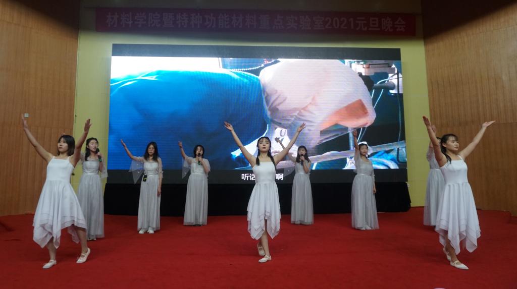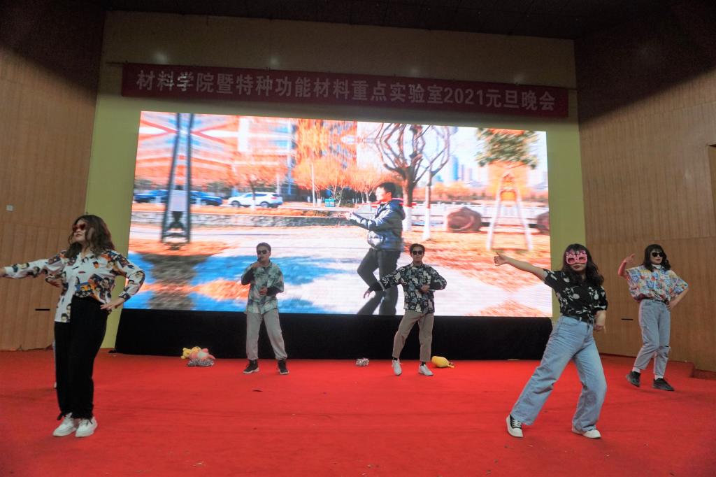 李林松老师课题组和小材宝们共同带来的歌舞《失恋阵线联盟》旋律欢快,让人消散忧虑,焕发生机活力。