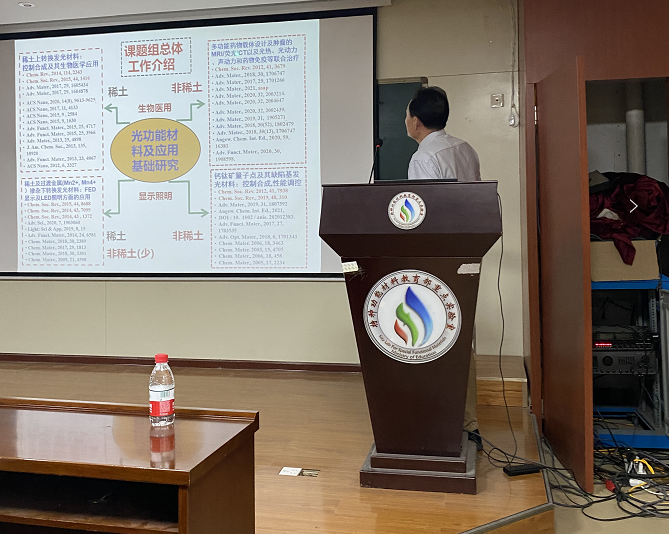 林君研究员围绕稀土上转换发光材料及过渡金属掺杂下转换发光材料开展研究,详细介绍了其在生物医学、FED显示、LED照明方面的应用。同时,林老师还介绍了多功能药物载体设计及肿瘤的MRI/荧光CT以及光热、光动力、声动力和药物免疫等联合治疗,以及钙钛矿量子点及其缺陷基发光材料的控制合成和性能调控方面的研究工作,展示了多功能药物载体在联合治疗方面的优异性,以及钙钛矿量子点的发光特性及其在显示照明方面的应用前景。精彩的研究成果和生动的讲解赢得了大家热烈的掌声。