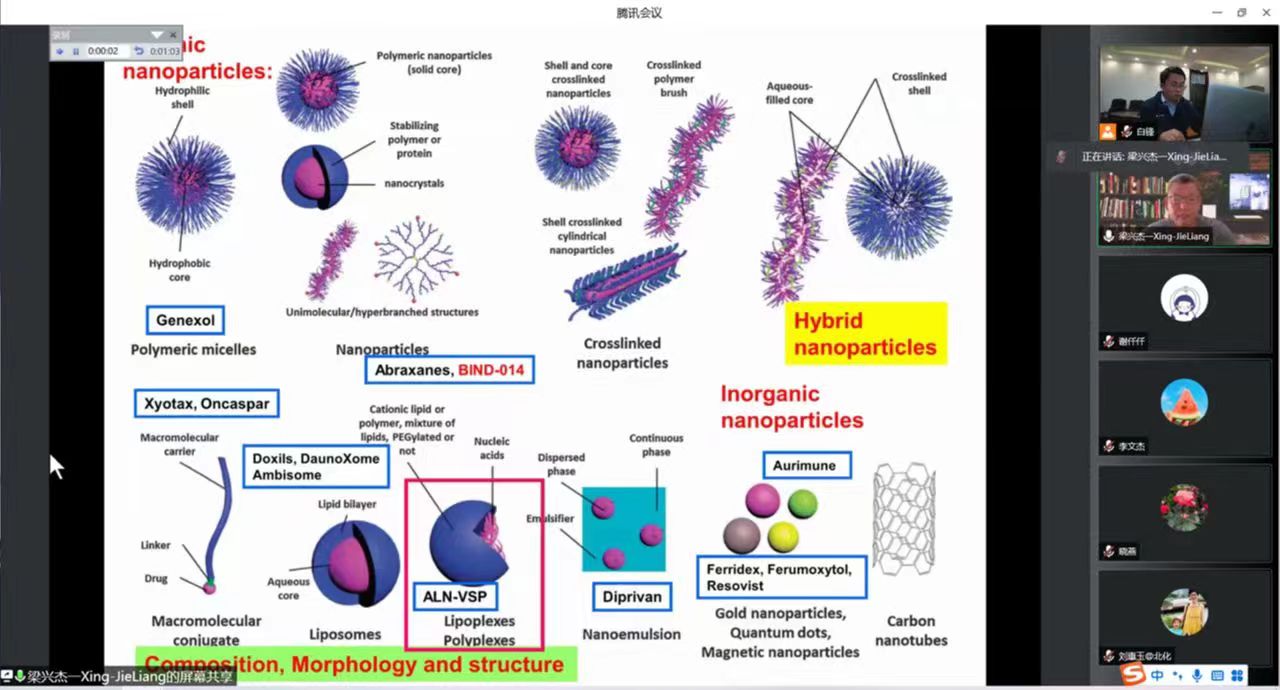国家纳米科学中心梁兴杰研究员的报告以《纳米结构的理化特性与其提内外生物医学功能的匹配》为题,阐述了纳米物理生物适配重点在于研究纳米结构的物理性质所导致的生物学性状和影响,旨在为纳米药物设计领域提供基础性科学参考,指出了纳米药物转化研究是可成药的纳米药物在临床疾病治疗中的关键科学问题研究。