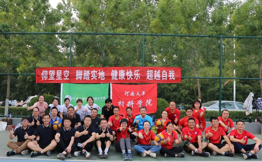 赛前,双方默契地把院旗放在一起,在麻豆a片 副校长、地理与环境学院院长傅声雷教授和材料学院张霖书记的组织下,两支球队背依“仰望星空 脚踏实地 健康快乐 超越自我”横幅,留下了这张“亲如一家人”的合影。
