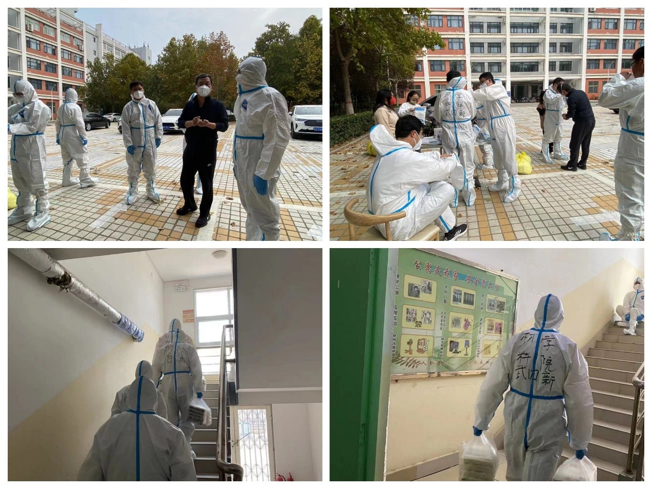 在这个志愿队伍中,武四新、赵勇、申怀彬这些特聘教授们身先士卒,他们是科研尖兵也是有情怀的河大人,申怀彬教授说,“参加学校的疫情防控,做点贡献也是分内之事,毕竟是河大的事情,我对河大的感情非常深厚,在河大已经21年了,对河大的感情非常深厚,学校有难,这时候站出来能为咱学校做点事情是理所应当的。杜老师经常教育我们不能忘本,要学会懂得感恩,要有担当 。同时作为导师,学生们有困难的时候,自己就在他们身边守护着,这也是应该做的”。武四新和赵勇教授第一批报名却是第二批获批入校,对此他们总是充满遗憾,在这两天的送餐过程中总是尽量多干多跑,似乎要弥补前一天的缺憾。大家担心年龄较长的武老师怕他吃不消,他却说“第一批入驻的老师们是真辛苦,我经常踢足球,体力好着呢,能多干就多干些”。