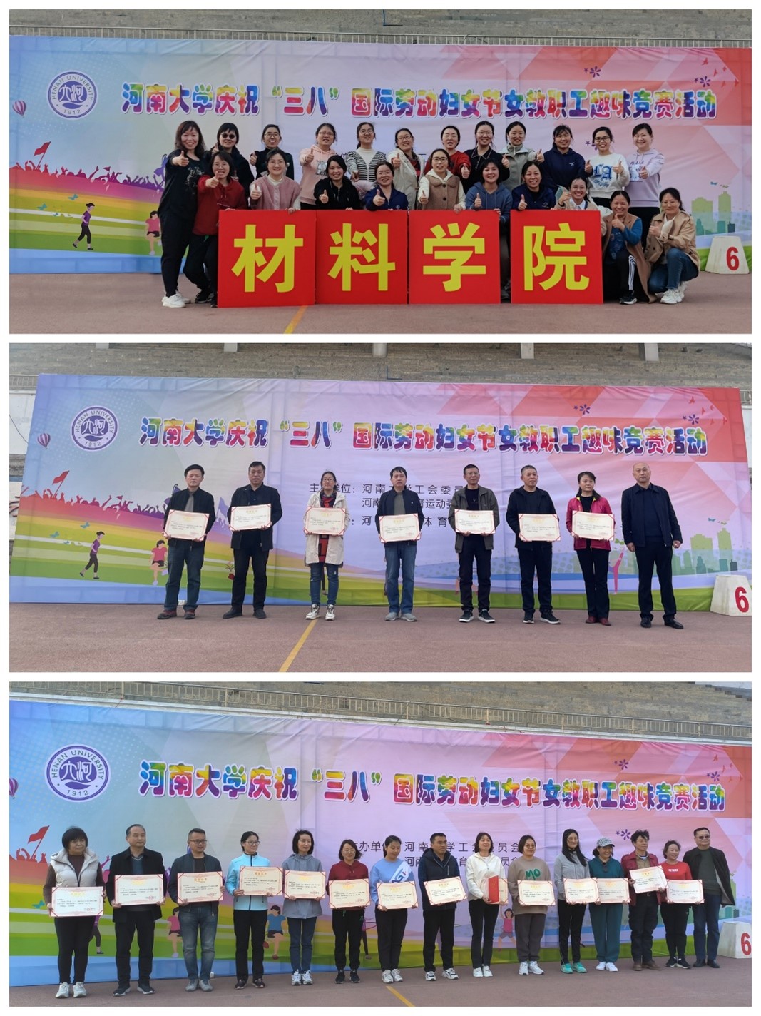 2023年3月2日下午,校工会在麻豆a片 金明校区志义体育场举行庆祝“三八”国际劳动妇女节女教职工趣味竞赛活动。材料学院工作积极组织女教职工队参加了比赛,分别荣获集体项目-踢毽球一等奖和划旱船二等奖的优异成绩。