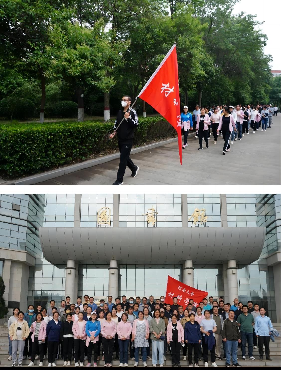 天公作美,阴雨转晴。下午4点,全体教职工准时集合,列成方阵从材料学院楼前出发,围绕校园开始健步走活动。大家昂首向前,精神饱满,边欣赏校园美景,边交流工作经验,迈着铿锵有力的步伐,一路欢声笑语。途径学校正门广场时,全体教职工短暂停留,在图书馆前合影留念。