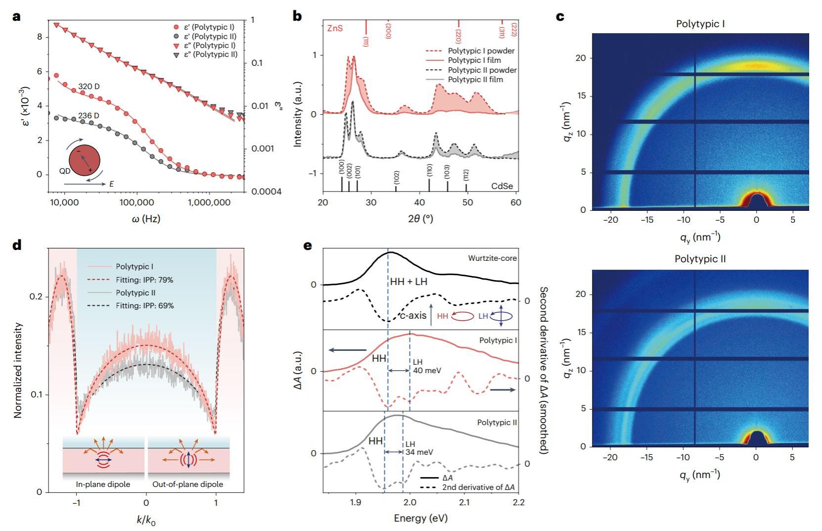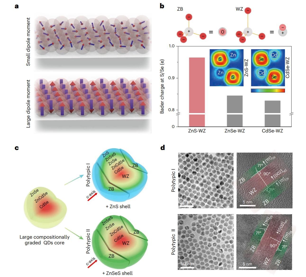 在本项研究中,研究人员开发出一种新型的多型晶体结构的量子点,使用纤锌矿CdZnSe核作为结构模板来外延生长纤锌矿 ZnS壳层,得到了纤锌矿与闪锌矿ZnS共存的多型晶体结构量子点(图1)。强离子性的纤锌矿ZnS提供了排列量子点所需的大电偶极矩;闪锌矿部分影响电子结构,从而促进每个量子点的取向发光,两方面结合实现了跃迁偶极矩取向的调控。