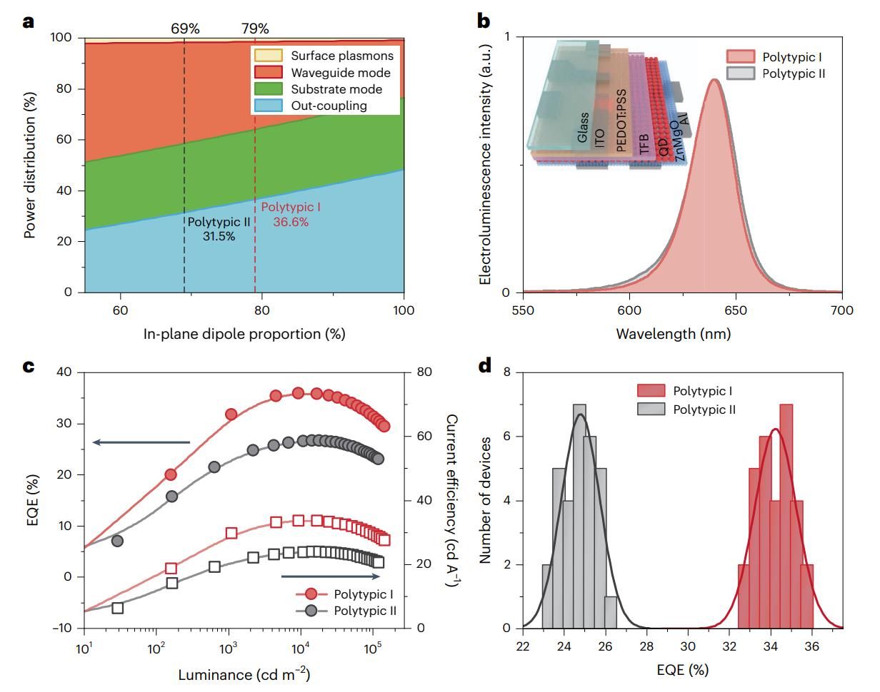 研究人员使用背焦面成像等手段确认了此量子点材料的跃迁偶极矩取向,具有79 %的面内偶极矩占比(图2)。使用该量子点制备的量子点LED表现出超高的效率和稳定性(外量子效率35.6%,1000 cd m-2亮度下T95寿命40,900小时,图3)。