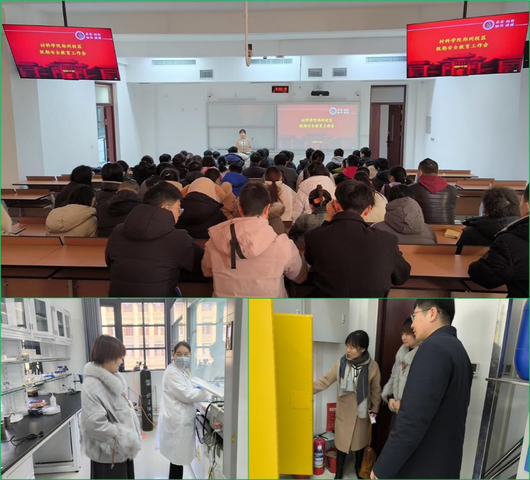 由刘谨、石宇珺带队赴郑州校区开展假期师生安全教育,传达学校、学院安全工作会议精神,结合郑州校区实际情况就实验室安全管理、隐患排查和学生安全管理做出具体要求。刘谨强调假期安全工作不能松懈,课题组长和青年老师要扛牢主体责任、抓牢抓细安全工作,加强实验过程的安全管理、认真落实学院日常巡查制度,强调留校学生禁止校内燃放烟花爆竹。石宇珺对假期留校学生提出用水用电安全等要求,同时强调学生与学院、辅导员、家长保持信息畅通,定期汇报离校返校情况。