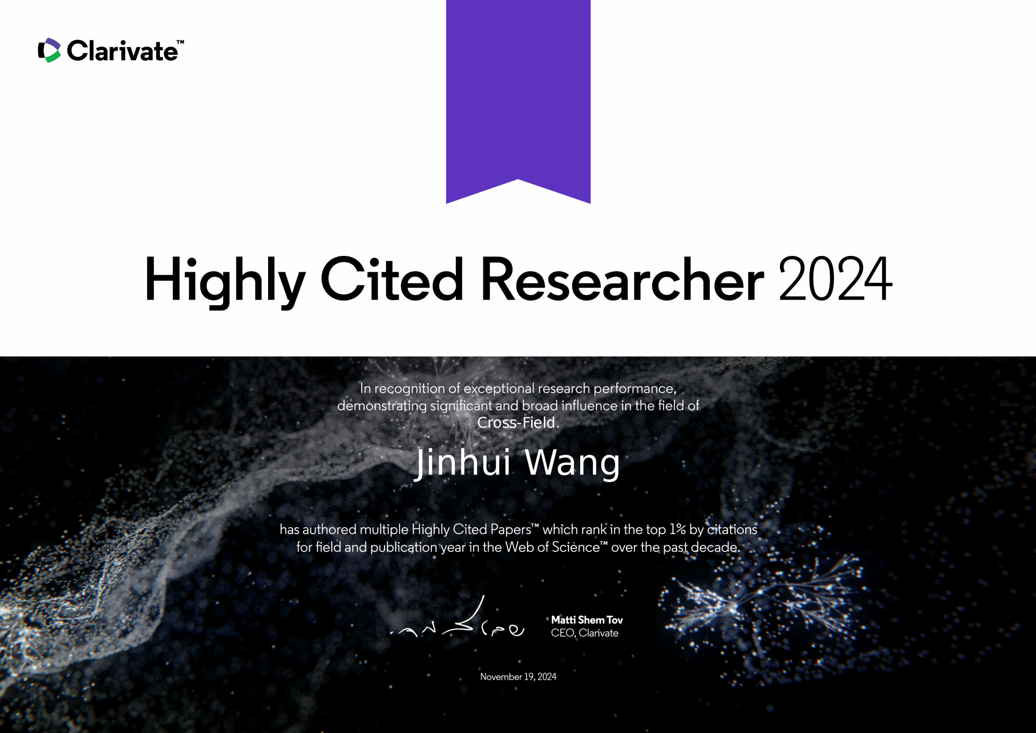 1119日,科睿唯安(Clarivate)发布了2024年度全球“高被引科学家”(Highly Cited Researchers)榜单,来自全球59个国家和地区1200多个机构的6636名科学家入选2024年度名单。麻豆a片 特聘教授王金辉成功入选该榜单,所属学科为“跨学科”。