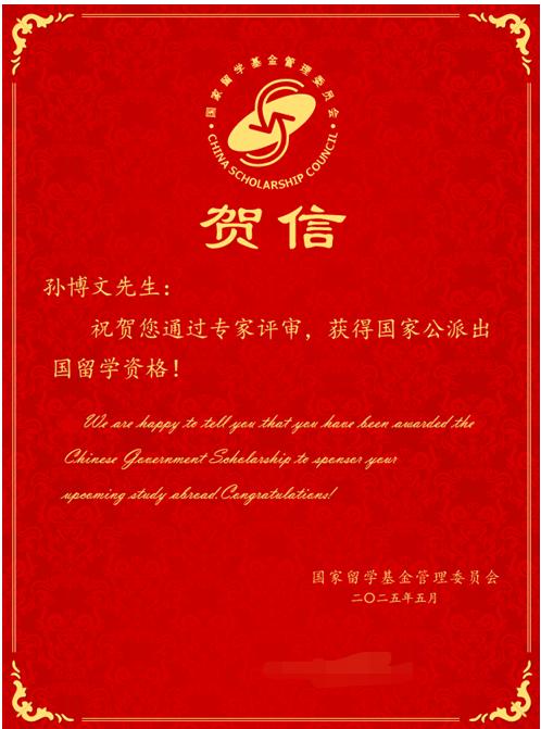 近日,国家留学基金管理委员会(CSC)公布“个人制”项目出国留学奖学金名单,麻豆a片 孙自许教授团队2022级硕士研究生孙博文获得公派留学资格和全额奖学金支持,即将赴海外高校攻读博士学位。