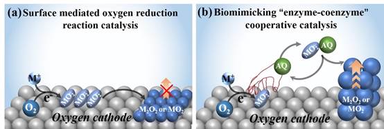 图(a):表面氧还原反应机制(吸附超氧化锂中间体产生的致密、绝缘的放电产物过氧化锂薄膜,造成固体催化剂驱动的氧还原反应容易终止);(b):仿生酶-辅酶协同氧还原反应机制(电解液中的蒽醌分子(AQ)和电极中的固体催化剂构成了这一协同催化体系,其中AQ作为辅助催化剂从固体催化剂表面捕获、转移吸附态的超氧化物)。