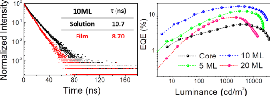 该工作通过“低温成核、高温长壳”的方法合成了一系列不同壳层厚度的ZnCdSe/ZnS核壳结构量子点。当ZnS壳层厚度介于2个单层至20个单层之间时,量子点的单颗粒荧光是非闪烁的、瞬态荧光单指数衰减。当ZnS壳层的厚度为10个单层时,所构筑的QLED器件的最大外量子效率达到~17%。