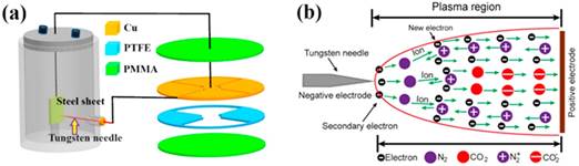 该工作利用摩擦纳米发电机引起的气体放电对CO2的高敏感性,发展了一种新型的自驱动CO2气敏传感器。研究发现,在针-板结构下进行负电压气体放电时,每种气体都存在一个能够放电的最大电极距离。当CO2加入到N2中时,放电过程中产生的     会阻碍等离子体的形成,增加气体放电的阈值电压并改变放电特性。基于这些现象,提出了不同类型的CO2气体传感模式。第一种模式是阈值浓度检测模式,当CO2浓度达到阈值时,通过使用放电停止现象实现CO2的高灵敏度检测。基于放电频率和放电电流对CO2浓度的依赖性,提出了台阶检测模式和连续检测模式,可用于检测CO2浓度低于阈值浓度的气体浓度。通过三种检测模式实现了对CO2在室温下的自驱动、高灵敏检测。本篇工作为开发CO2气敏传感器提供了新的方法,在发展面向物联网的自驱动气敏传感网络中具有潜在的应用。