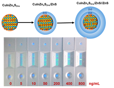 通过向CuInZnS量子点核加入大量的锌前驱体以及在高温下长时间连续补给壳层前驱体的方法,控制壳层的厚度和核壳界面的合金度,成功得制备了厚壳层非镉量子点,克服了CuInS/ZnS类的量子点其厚壳层难以生长的问题,得到了粒径均一且尺寸约7.8 nm的量子点。这种方法不仅可以降低量子点核和壳之间的晶格失配,也减少了量子点的表面缺陷,提高了量子产率(约为77%),是迄今为止量子产率大于70%的CuInS/ZnS类量子点中壳层最厚尺寸最大的量子点。相对于薄壳层的CuInZnS/ZnS量子,得到的CuInZnS/ZnS//ZnS量子点由于厚壳层的包覆,在转移水相后仍能保持较高的量子产率(约为58%),同时在各种pH的酸碱溶液中以及在紫外等的连续照射下表现出良好的稳定性。将这种量子点标记C-反应蛋白制备荧光探针,结合侧向免疫层析技术和荧光检测技术,实现了对炎症标志物C-反应蛋白的快速定量检测,具有较宽的检测范围和较高的检测灵敏度。这种高质量的CuInZnS/ZnS // ZnS量子点作为非镉的荧光标记材料,将会在POCT检测和其它生物医学应用中具有很好的应用前景。