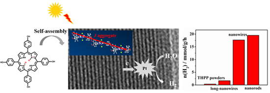 采用本课题组开发的酸碱中和/胶束限域可控自组装方法实现了四苯羟基卟啉(THPP)的可控自组装。通过选择和设计分子间的相互作用,调节和控制卟啉分子之间的弱相互作用,实现了THPP可控自组装,制备了一系列不同尺寸的一维纳米组装体。利用组装体长程有序的π-π堆积,有效的增强组装体的可见光吸收截面积,增强分子间激发态能量和电子转移的效率,降低电子-空穴的复合,提高激发态电子-空穴寿命,获得高效可见光光解水催化效果。该成果“Self-Assembled One-Dimensional Porphyrin Nanostructures with Enhanced Photocatalytic Hydrogen Generation”发表在国际顶级期刊Nano Letters上(Nano Letters 2018,18,560-566),麻豆a片