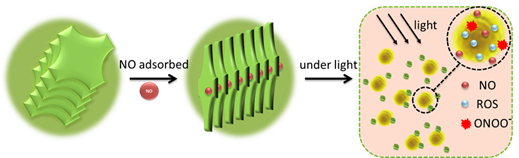利用NO与四吡啶基锌卟啉(ZnTPyP)分子中心锌的配位作用,实现了NO的可控吸附,所得材料与传统的NO释放材料相比具有更高的吸附能力,同时具有更好的暗稳定性,避光室温保存6个月,无明显变化,克服了传统材料不易保存的缺点。同时实现了可见光(630 nm)控制的NO释放,释放出的NO与ZnTPyP光照产生的单线态氧反应生成具有高效抗菌活性的超氧自由基,实现了高效杀菌效果。该成果“Synthesis of Self-Assembled Porphyrin Nanoparticle Photosensitizers”发表在国际顶级期刊Acs Nano上(ACS nano DOI:10.1021/acsnano.8b01010),麻豆a片