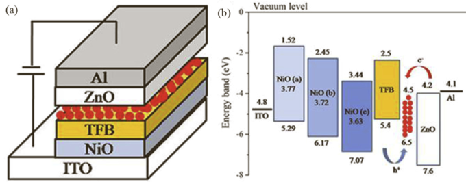 基于NiO纳米晶作为空穴注入层的红光QLED的亮度与电流效率分别可达25580 cd m-2和 5.38 cd A-1,最为关键的是,器件的使用寿命可达到11491 h,是以传统的PEDOT作为空穴注入层QLED器件寿命的6倍。