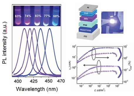 该研究工是通过采用“低温成核高温生长壳层”的非传统合成方法获得了量子产率达83%,荧光范围可覆盖400-455nm范围的无镉ZnSe/ZnS核壳结构量子点。该方法合成的量子点拥有高的稳定性,高色纯度(半峰宽为12-20nm),高量子产率等优点。本文采用该方法合成的ZnSe/ZnS核壳结构量子点构筑的无镉蓝紫色QD-LED最高亮度达到2632 cd/m2(EL=428nm),外部量子效率(EQE)达到7.83%,与先前报道的无镉蓝紫色QD-LED相比,效率提高12倍,亮度增加100倍,为以无镉量子点为基础的蓝紫色照明和显示等相关应用提供了更大的可能性。