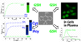 含巯基氨基酸具有重要的重要的生理功能或药理作用,对这些氨基酸的快速、便捷检测对于药品质量控制,食品分析,医疗诊断,及基础研究领域都有重要意义。项目组通过对BODIPY染料8位(Meso位)的合理修饰,利用离去基团对CysHcyGSH反应的速率和机制的差异,从两个不同检测波段实现对Cys/HcyGSH的区分检测,对GSH的检测极限达到10 nm (3 ppb),并且在溶液、血浆、细胞层面上都能实现区分检测。