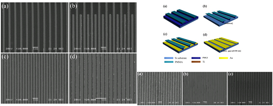 我们在传统的纳米压印技术中引入了双层胶剥离技术(PMGI和PMMA共同作为转移层)来构筑100纳米以下间距可控的纳米电极。首先通过纳米压印技术在上转移层PMMA上得到等比例的纳米电极图案,然后通过对下转移层PMGI显影时间和显影液浓度的控制来调控其特征尺寸的大小,最终达到电极间距可控的目的。结果分析表明,在对下转移层显影过程中会出现“undercut”现象,通过控制“undercut”的尺寸可以有效的缩小和调控纳米电极的间距。电极模板的间距分别为800 nm,400 nm,200 nm,100 nm的电极经过纳米压印和双层胶剥离以后,其电极间距可控,并且最小电极间距可分别缩小为440 nm,120 nm,80 nm,70 nm, 同时电极的转移厚度也得到了极大的提高(150 nm)。通过这种改进的纳米压印技术可以用来制备间距可控的纳米电极,且电极的尺寸特征不再受限于模板的尺寸特征,大大降低了纳米压印技术的成本,有望为纳米电子学的发展起到有益的促进作用。