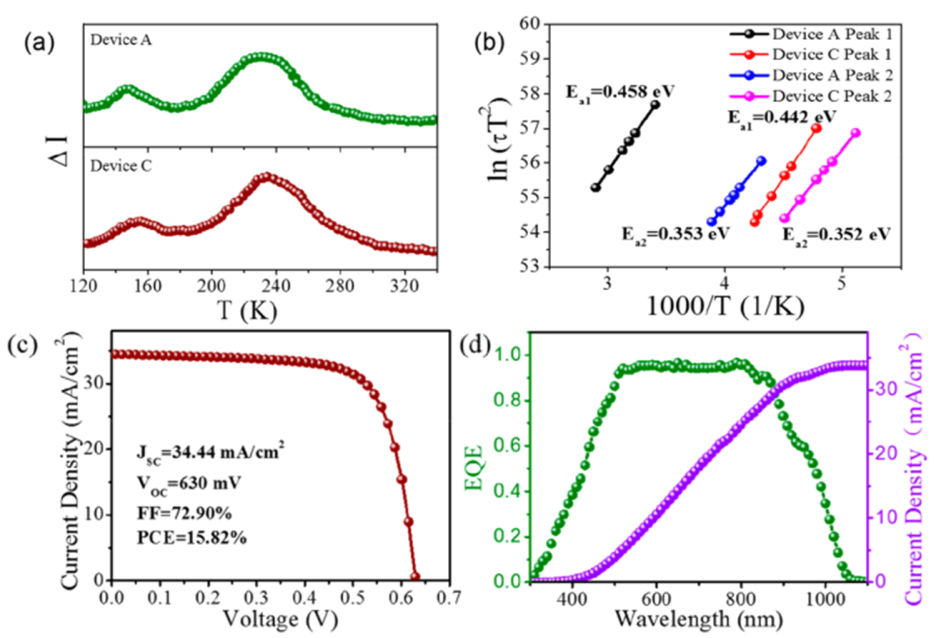 CIGS器件(Device A)和Ag掺杂CIGS(Device C)的DLTS信号(a)和DLTS信号对应的阿伦依乌斯拟合图(b),DLTS结果表明主要是InCu和VIn缺陷得到抑制。(c)Ag掺杂CIGS器件15.82%效率的J-V图,(d)CIGS器件的EQE图谱,表明Ag钝化的CIGS吸收层具有良好的光利用特性。