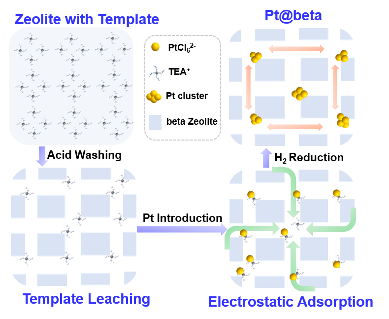本研究报道了一种利用模板剂诱导途径合成beta分子筛(BEA-type)封装高分散贵金属(Pt)的策略。如图1所示,将水热合成的beta分子筛使用酸洗去除部分模板剂。随即采用离子交换法,利用beta分子筛中孔道内TEA+分子与金属离子(PtCl62-)的静电结合作用,将金属纳米颗粒区域选择性封装于分子筛孔道交叉处。通过后续热处理过程,在宽硅铝比范围下(Si/Al=15~200),制备出了具有高分散金属特性的beta分子筛封装金属催化剂。其在酚类化合物的加氢脱氧反应表现出优异的催化活性和选择性。相比于传统合成策略,此项研究成果提供了一种宽硅铝比条件下的分子筛封装金属催化剂合成的新思路(Angewandte Chemie International Edition 2021, DOI: 10.1002/anie.202108059)。