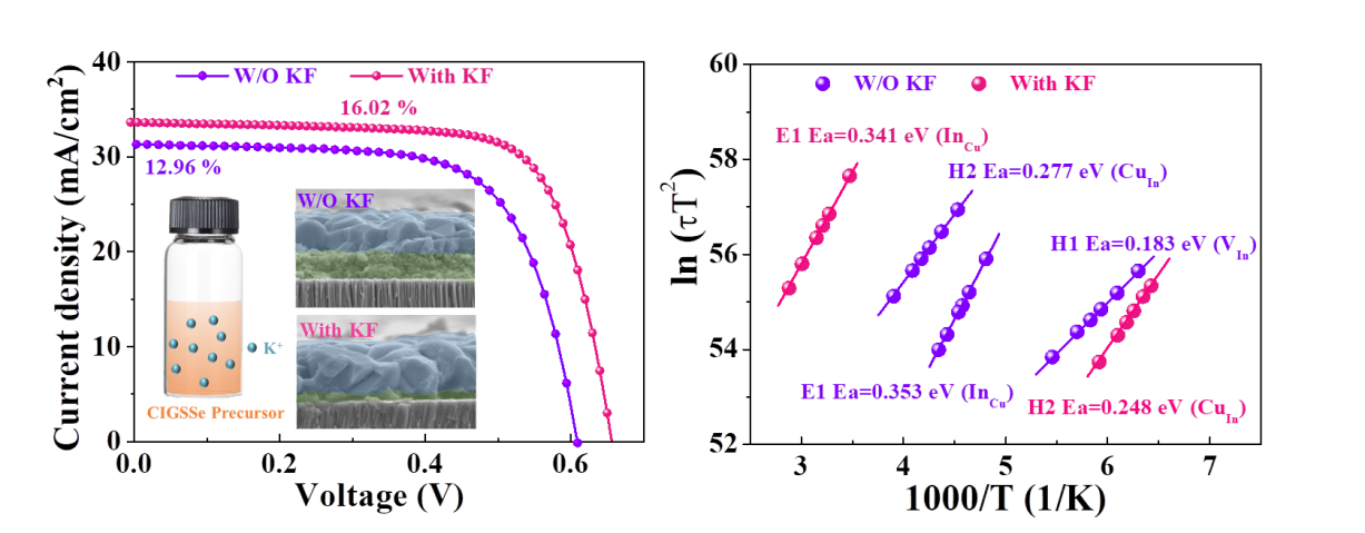 对于溶液法制备的Cu(In,Ga)(S,Se)2 (CIGSSe)太阳能电池来说,不理想的结晶质量和吸收层内深能级缺陷是限制其效率提升的关键因素。在本工作中,研究人员在CIGSSe前驱体溶液中引入KF,通过原位碱金属K掺杂来促进吸收层结晶并钝化深能级缺陷。本工作系统研究了K对CIGSSe吸收层结晶性提升和缺陷钝化的机制。研究结果表明,K的掺入在吸收层结晶初期形成了K2Se3化合物,可以降低吸收层的熔点并提供更充足的Se源,促进CIGSSe吸收层结晶。K的引入使吸收层体内的深能级缺陷InCu、CuIn和VIn缺陷的浓度和能级均得到降低,有效减少了复合中心。同时K元素在吸收层表面形成了K-In-Se化合物,可以降低吸收层表面的价带能级位置,抑制载流子在CdS/CIGSSe界面的复合。通过提升吸收层结晶性、抑制带尾态效应、钝化缺陷和降低界面复合,溶液法制备的CIGSSe太阳能电池在开路电压和填充系数方面都得到显著改善,获得了16.02%的器件效率。这是基于碱金属掺杂溶液法制备的CIGSSe太阳能电池的最高效率。本工作有助于研究者深入理解碱金属对溶液法制备CIGSSe吸收层微观结构的影响和器件性能提升的物理机制。