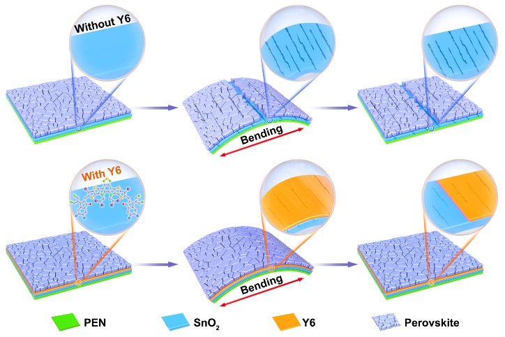 柔性钙钛矿太阳能电池(PSC)以其柔韧性和便携性的优势一直备受关注,然而柔性PSC最大的问题在于其柔韧性、优异的器件性能以及稳定性不可兼得。在本研究中,我们利用有机非富勒烯Y6改善金属氧化物SnO2和钙钛矿的界面接触、电荷传输、界面处的机械稳定性,进而实现高效且具有良好机械稳定性的柔性PSC的制备。结果表明,Y6的引入可以有效的改善金属氧化物和钙钛矿界面处的机械性能,有效释放界面处的应力。进一步对器件进行弯折测试,Y6修饰后的器件在弯折1000次后器件能保持80%以上的初始效率,而原始的参考器件在经过同样的弯折条件时,器件仅仅能保持60%的初始效率。