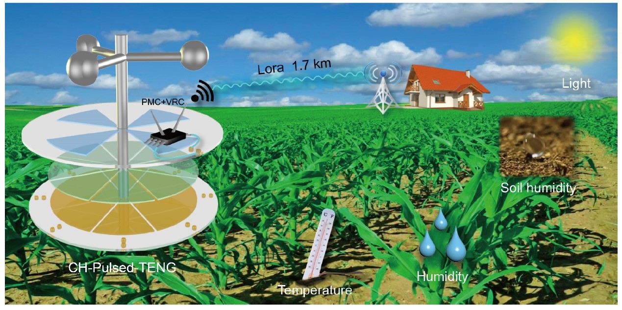 粮食事关国运民生,粮食安全是国家安全的重要基础。确保粮食安全需要增强农业科技创新能力,提高粮食生产水平。传统耕种凭经验施肥、灌溉,不仅浪费大量的人力物力,对环境和水土保持也构成了严重威胁,对农业可持续性发展带来严峻挑战。现代科学技术使农业朝着更加智能的方向发展。智慧农业是指利用物联网、大数据等技术,将大量的传感器放置在农田中,实时获取农田的温度、湿度、光照强度和土壤湿度等信息,进而实现对农田的精细化管理,起到减少资源浪费,提高粮食产量的目的。利用环境友好的、天然可降解的材料制备Pulsed-TENG,设计高效电源管理电路、低功耗并且能够远距离传输的无线农业传感系统是发展自驱动农业传感系统的关键。