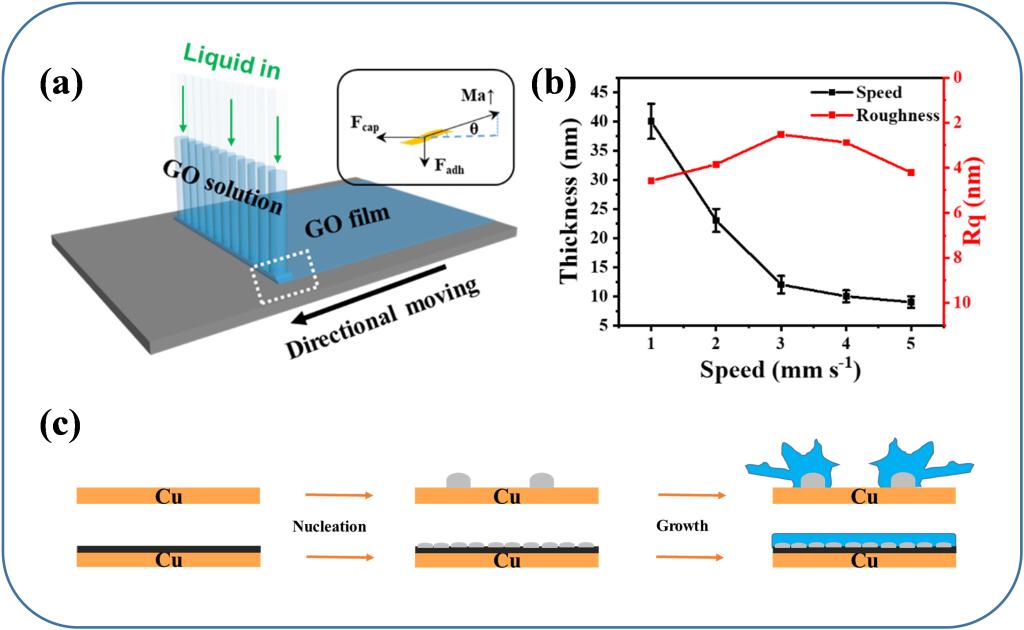 图(a)毛细管阵列液桥法制备氧化石墨烯(GO)薄膜示意图;(b)刷膜速度对石墨烯薄膜厚度与均匀性的调控;(c)石墨烯薄膜修饰铜集流体促进锂均匀沉积的可能机制。