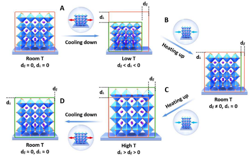目前金属卤化物钙钛矿光伏器件在快速和极端温度变化下等一系列应用场景的稳定性仍然具有重大的挑战,其应用场景包括集成到航空航天飞机,高空伪卫星,国际空间站,对地静止卫星和火星探测器等。课题组研究了钙钛矿光伏器件在-160℃到150℃的温度范围内晶体结构变化和器件性能的相互影响。本研究结果表明,在变温过程中,钙钛矿晶体将发生相变和晶体失序,进而导致器件光电性能的下降。除了相变外,变温过程中,温度的降低和升高分别导致了钙钛矿晶体在平面外和平面内方向的收缩和膨胀不一致。进一步验证了钙钛矿晶格应变和器件光电特性的关系,文章证明了钙钛矿光伏器件在极端温度环境下运行的可行性,同时也分析了钙钛矿基光电器件在极端温度环境下工作的挑战和潜力。