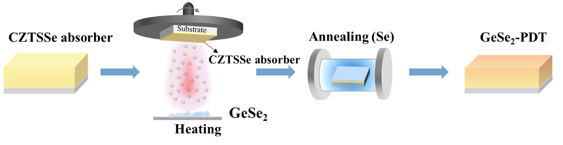 环境友好的CZTSSe是高效率薄膜太阳电池的理想光吸收层材料。现阶段限制CZTSSe光伏器件效率持续提升的一个重大瓶颈问题是其开路电压亏损较大,异质结耗尽区内存在的深能级缺陷作为光生载流子非辐射跃迁复合中心,对器件开路电压和效率的影响至关重要。在前期的研究中,课题组通过在CZTSSe光伏器件背电极上沉积Ge金属单质。通过后期高温硒化过程中Ge元素的扩散,成功地把Ge元素掺杂到CZTSSe晶格中并取代部分Sn。结果表明,Ge元素的引入可以有效抑制吸收层中的SnZn深能级缺陷和[2CuZn+SnZn] 缺陷簇的形成几率(J. Energy Chem., 2021, 61, 1-7)。由于在高温硒化过程中Ge的挥发和无序扩散,使其对器件耗尽区内部深能级缺陷钝化受到限制。针对这一问题,研究团队通过GeSe2表面沉积后处理工艺(GeSe2-PDT)(见图1),通过优化后期热处理条件控制Ge的扩散,在吸收层上表面引入较高浓度的Ge取代,有效钝化了异质结界面的有害深能级缺陷,改善了界面复合,大幅提高了CZTSSe光伏器件的开路电压和光电转化效率。本研究工作提出了一种有效钝化CZTSSe吸收层表界面深能级缺陷和缺陷簇的方法,为解决CZTSSe 太阳电池开路电压损耗问题提供具有针对性的解决方案。