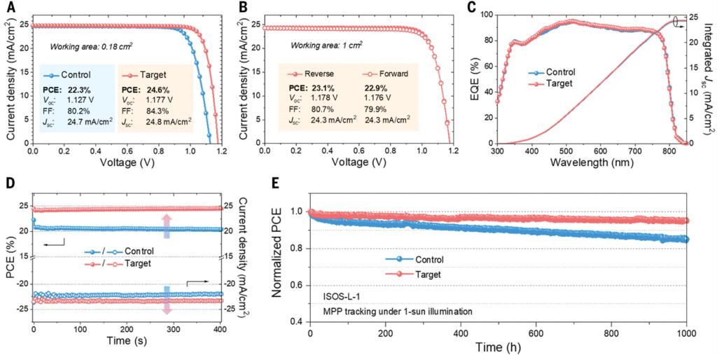 李萌教授课题组和德国亥姆霍兹柏林材料与能源中心Antonio Abate教授等合作,使用β-聚(1,1-二氟乙烯)聚合物偶极子调控钙钛矿薄膜的结晶及排列,构建了变温自调节光伏器件 获得了具有优异耐变温特性的高效钙钛矿太阳能电池。研究团队制备的p-i-n钙钛矿太阳能电池,有效面积18平方毫米的器件PCE达到了24.6%,1平方厘米的器件PCE达到了23.1%,在25°C和75°C下进行1个太阳光照射最大功率点跟踪1000小时后,分别保持了初始器件效率的96%和88%。在-60°C和+80°C之间快速变温循环下性能稳定超过一百个周期。