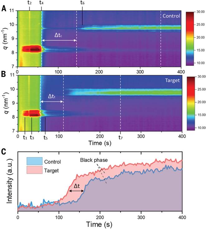 研究团队基于同步辐射加速器的原位掠入射广角X射线散射(GIWAXS)研究了钙钛矿的结晶动力学,以监测整个成膜过程(图2):β-pV2F促进了中间相向钙钛矿黑相的转化。结果表明β-pV2F通过降低钙钛矿形成能、促进相转化进而实现更有序的晶体结构调控。