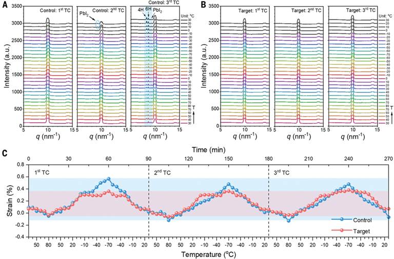 为了深入研究器件优异耐变温特性的来源,利用同步辐射GIWAXS进一步研究了变温过程中β-pV2F对钙钛矿薄膜的形态和晶体结构的影响。如图5A,B所示,目标钙钛矿中温度诱导的薄膜降解受到了抑制,同时变温过程中晶粒挤压引起的晶界形变也受到抑制,目标钙钛矿结构稳定性显著提高。如图5C所示,钙钛矿应变随温度循环而产生变化,表明钙钛矿中的晶格参数发生变化;相比之下,目标钙钛矿在较窄的范围内(-0.06%至0.38%)表现出稳定的应变循环,这表明目标钙钛矿具有可恢复的晶体结构和可释放的晶格应力。